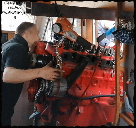 Unmittelbar darauf veränderte sich der Ton der Maschine, an Deck waren leichte Vibrationen spürbar. Ich warf meinen Blick sofort auf den Auspuff, der noch immer Kühlwasser ausspuckte. Die Drehzahl der Maschine fiel ein wenig ab, erholte sich aber sofort wieder. PUNKT 1 Ich ging daher von möglichen Verunreinigungen im Diesel aus und begab mich zur Maschine. Die BELUGA ist mit einer SEPAR Doppelfilter Anlage ausgrüstet und kann im Falle von Filterproblemen im laufenden Betrieb umgeschaltet werden. Die Glasbehälter der Filter zeigten sauberen Diesel. Beide Dieseltanks wurden Mitte Juni 2020 auf Helgoland frisch gefüllt Die Filtereinstellung wurde daher belassen. Ich konnte an der Maschine auch keine Auffälligkeiten (Öl- oder Wasserdampf, Geruch,...) feststellen. Mit einer berührungslosen Messung der Temperaturen wurde am inneren Kühlkreislauf 86°C und am Auspuffausgang 52° gemessen. Wegen Unauffälligkeit verließ ich den Maschinenraum und ging ich daher zurück zum Aussensteuer. Die Drehzahl fiel erneut deutlich ab, deshalb kuppelte ich aus. Der Motor ging aus und ließ sich nicht mehr starten = der Anlasser drehte sich nicht mehr. „Klack, ohne brumm“. Bei diesem Anlassversuch konnte ein deutlicher Spannungsabfall (ähnlich einem Kurzschluß) beobachtet werden. Ich unterließ daher weitere Suche nach möglichen Ursachen und begab mich zum Aussensteuer, da das Containerschiff zwischenzeitlich sehr nahe kam und wir manövrierunfähig im Fahrwasser trieben. Nahe Punkt 2. Ich setzte einen PAN-PAN ab und meldete meine Manövrierunfähigkeit um eine Kollision mit dem zwischenzeitlich sehr nahe kommenden (400mtr) Containerschiff zu vermeiden. Zeitgleich setzen wir Segel und konnten uns gezielt (bei ca. 1 Bft) aus dem Fahrwasser bringen. Da die BELUGA (mit 22to Gewicht) keine guten Segeleigenschaften besitzt, halsten wir unter Genua mehrfach am Fahrwasserrand und begannen währenddessen das Groß zu setzen. Die Insel Lühesand kam dabei ebenfalls recht nahe. PUNKT 2 Nachdem das Containerschiff passierte segelten wir zum N-lichen Elbufer. Dort waren etwas bessere Winde erkennbar und mehr Raum für Manöver. PUNKT 3: Ein vorbeifahrendes RIB schleppte uns von dort zum Yachthafen Hamburg in Wedel in dem wir ohne weitere Schäden sicher anlegen und liegen konnten. Am Freitag, dem 7.8.2020 wurde von Firma Fink&Bliese (Timo Fink) festgestellt, dass die Maschine fest ist. Ein manuelles Drehen des Motors war auch mit großem Kraftaufwand nicht mehr möglich. Herz-OperationIn einer fünfeinhalbstündigen Aktion mit Gabelstapler, Traverse und viel Feingefühl für 600Kg Gewicht seitens des Werft Operators, erblickt unser Motor wieder das Tageslicht. Schweißtreibende Millimeterarbeit vom Ausfädeln aus dem Bauch über das vorsichte „Hindurch- oder Vorbeibewegen“ an Decksaufbauten, Luken und Niedergang, bis das Teil endlich über die Reling geschwenkt zum Boden manövriert wird. Wem jetzt 5 ½ Stunden viel vorkommen, dem sei gesagt, dass wir in Frankreich beim Einsetzen des Motors noch das zusätzliche kommunikative Problem mit deutsch- englisch und französischen Werkstattvokabular hatten, und volle drei Tage für die adäquate Aktion brauchten. Nun ist unser „Herzstück“ jedenfalls in Berkenthin bei Fink & Bliese in der Werkstatt. Beeindruckend, wenn "Henry Ford" plötzlich, wie in einer Explorer Zeichnung in Einzelteile zerstückelt, ausgebreitet auf dem Boden verteilt umherliegt. Was das sonst kompakte Teil plötzlich für Platz beansprucht! Doch nun sind die heimtückischen Schäden sichtbar. Der Befund
